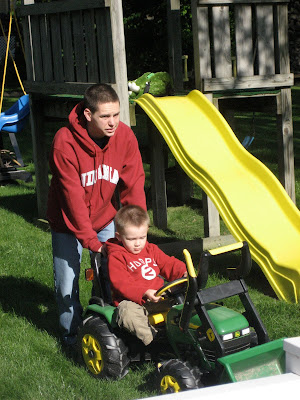 Riding his tractor at Grandma and Grandpa's house...he hasn't quite figured out how to pedal yet, but he loves being pushed around!